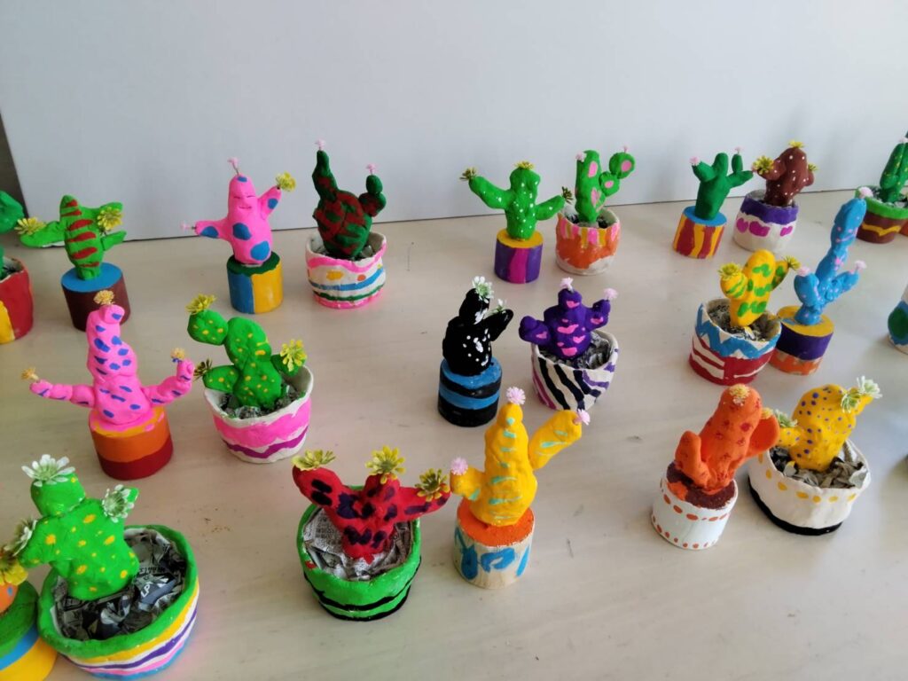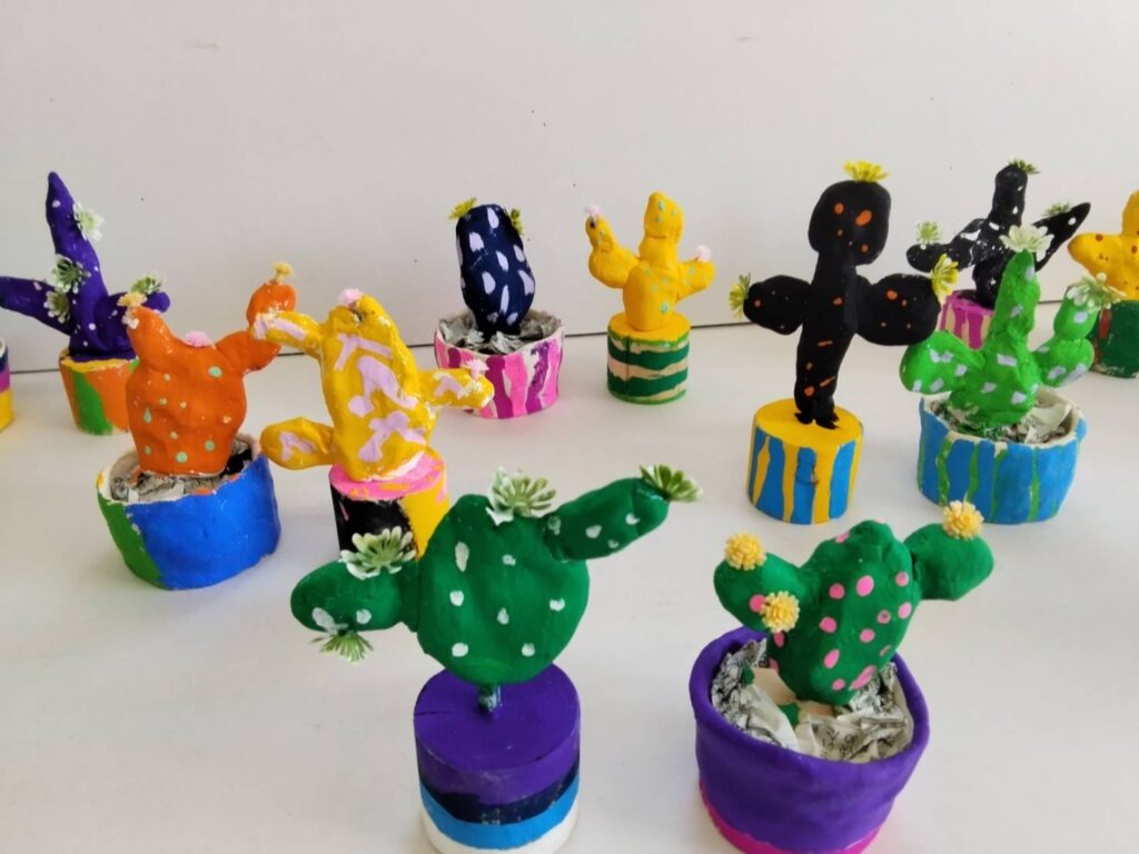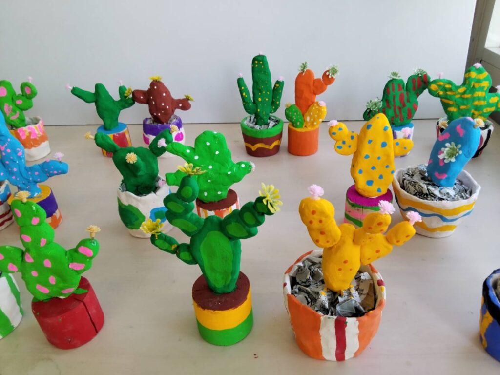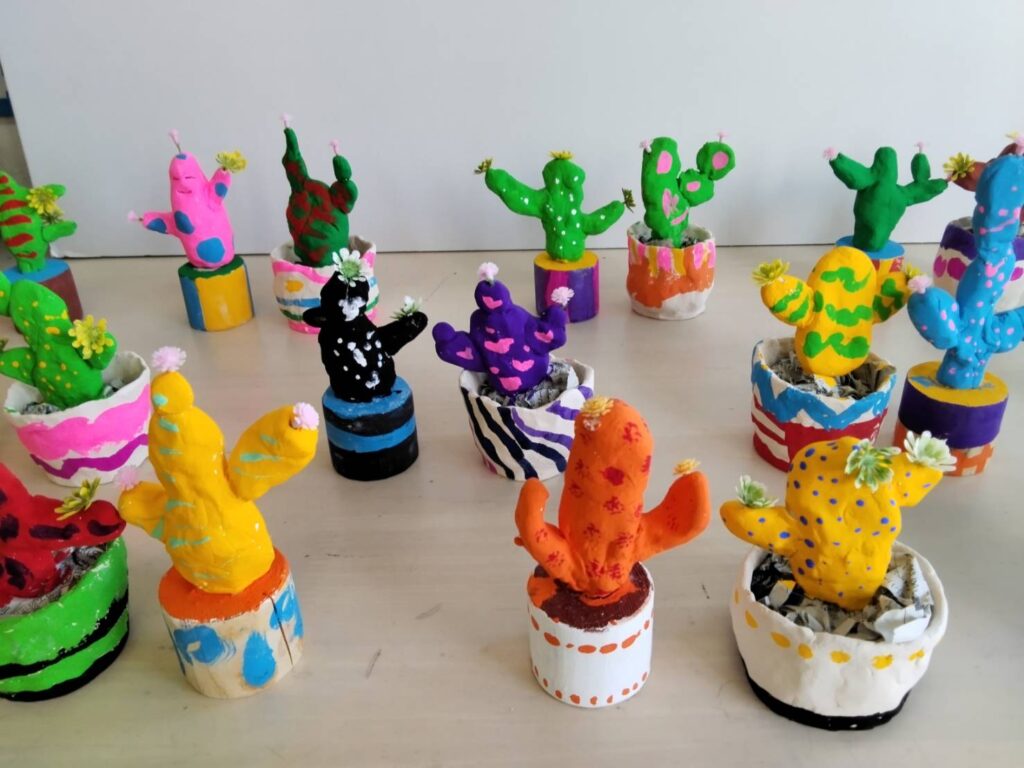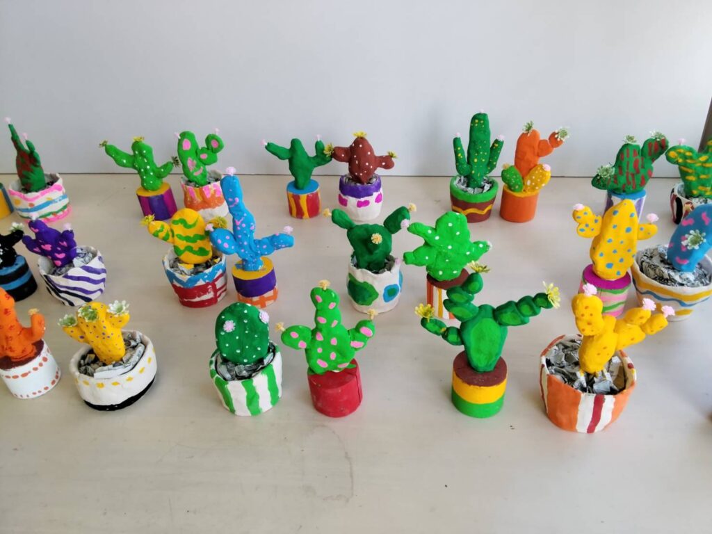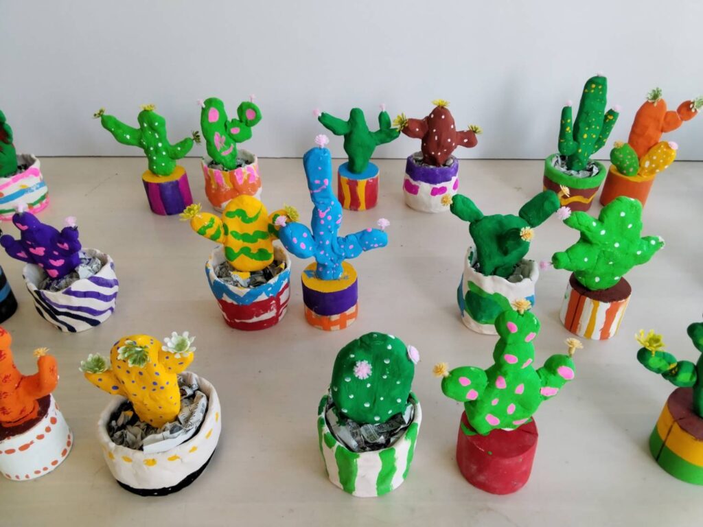 自作した素焼きの鉢にペイントして粘土で作ったサボテンを入れました。