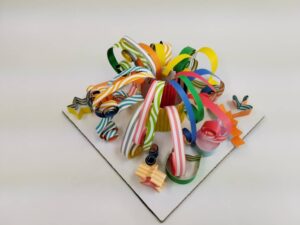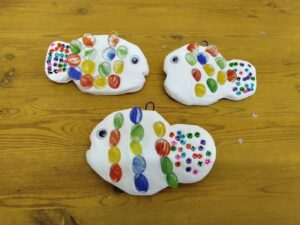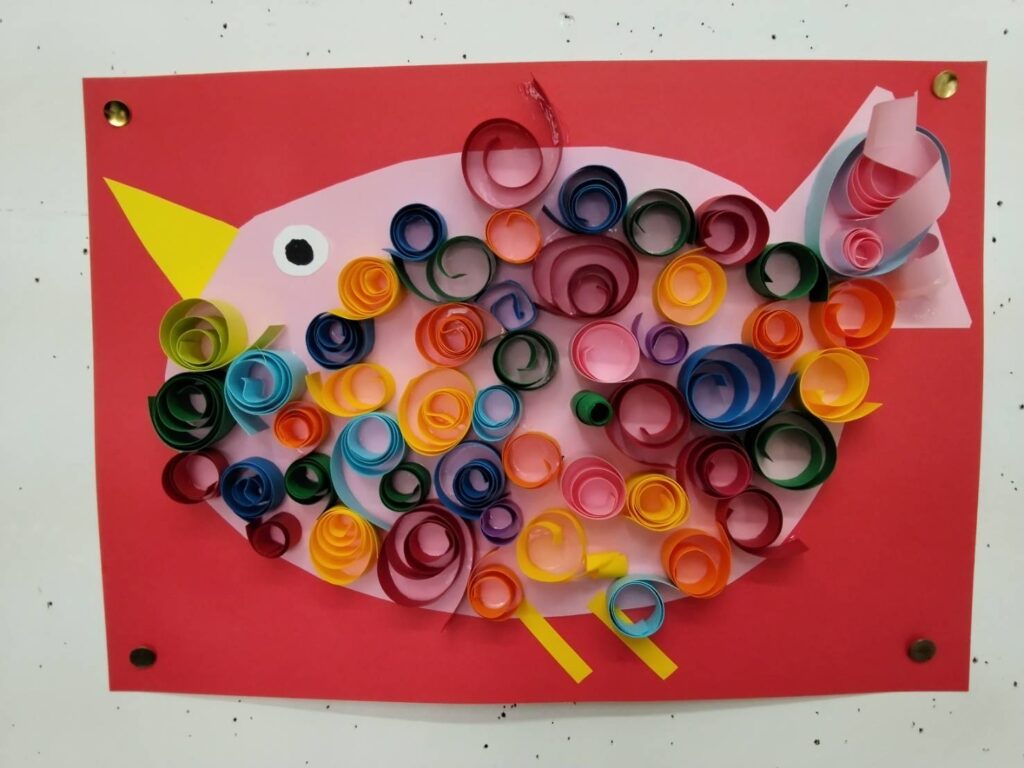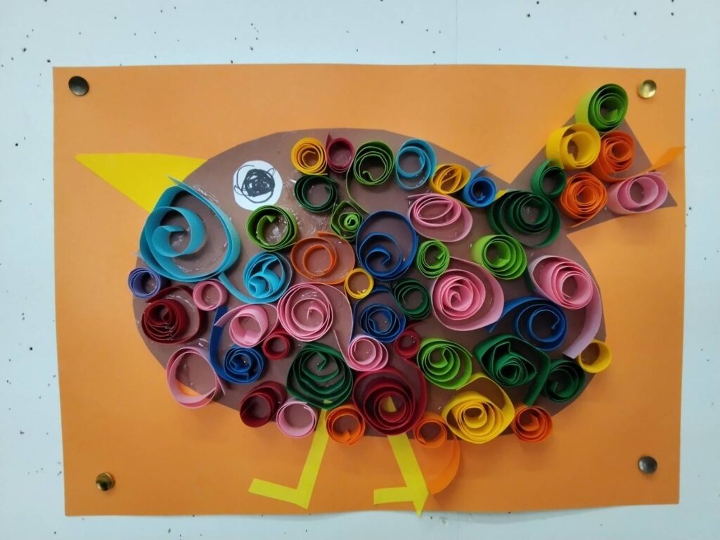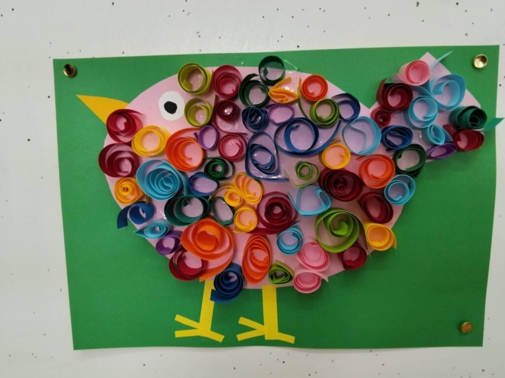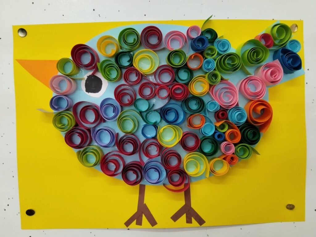ふわふわ鳥(幼児の部) 2025年9月21日 最終更新日時 : 2025年9月23日 星の子 画用紙いっぱいに描いた鳥のからだに細長の色画用紙をクルクル巻いて貼り付けました。カラフルな羽根の素敵な鳥になりました。